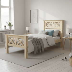 Fabricada en madera de pino seleccionada, su estructura sólida garantiza durabilidad y firmeza. El diseño con cruces decorativas en los laterales y respaldo le aporta un toque artesanal que se adapta tanto a ambientes modernos como rústicos.
